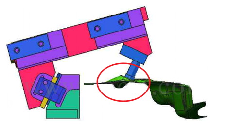 為解決零件反方向沖孔整形,例如下圖后蓋內(nèi)板沖孔整形等。我司新開發(fā)MLGQ斜楔,主要作用于零件反方向沖裁等工作。